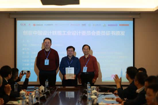创意中国设计联盟顾问、中国工业设计协会特邀副会长陈汗青与创意中国设计联盟副主席、清华大学美术学院林华共同为新当选的创意中国设计联盟工业设计委员会主任、江西财经大学设计与艺术学院院长李民颁发证书。