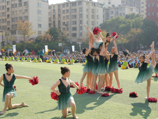 开幕式最后环节是精彩纷呈的文体节目表演。活力四射的啦啦操、时尚动感的街舞、深情动人的合唱以及整齐划一的大课间操展示轮番上演,充分展现了学校阳光体育活动和美育教育的丰硕成果,将现场气氛推向高潮,整个运动场化为一片欢乐的海洋。