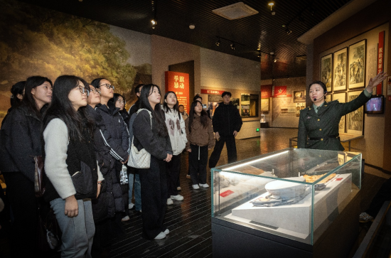 仪式后,一堂“行走的思政课”随即拉开帷幕。师生们跟随讲解员,走进纪念馆展厅。珍贵的历史图片、厚重的革命文物,以及生动复原历史场景的雕塑与多媒体影像,瞬间将大家带回那段风雷激荡的岁月。“军叫工农革命,旗号镰刀斧头”的壮阔诗篇仿佛穿越时光,在实物与图景间浮现。在湘赣边秋收起义前敌委员会旧址——萧永翁祠内,师生们近距离参观陈列的会议桌和抗战士兵的卧室,在沉浸式观览中深切体悟“红色政权来之不易、新中国来之不易”。