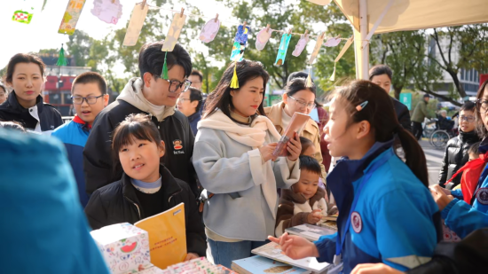“阿姨,这本《童年》是经典名著,现在捐10块钱,还能为困境小伙伴献份力!”不少市民被这份真诚打动,带着孩子驻足选购,在支持公益的同时,也让孩子感受奉献的意义。每次捐款完成后,同学们都会将自制绿书签与书一起递与市民,让绿色阅读与版权保护理念随书香传递。“从整理书籍到现场推销全是我们自己动手,虽然累但特别有成就感。”统筹摊位的张同学满足地说道,手上整理物品的动作始终不停。