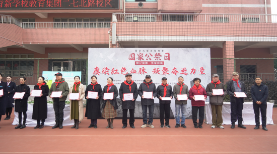 当天上午9时,活动拉开序幕,全体与会人员肃立,为南京大屠杀死难同胞默哀。抗战老兵后代、南昌市东湖区人民武装部代表、南昌航空大学航空服务与音乐学院代表与南昌市育新学校教育集团二七北路校区师生一同向英烈敬献鲜花,表达深切缅怀与崇高敬意。活动中,南昌市育新学校教育集团二七北路校区还为校友代表颁发了“荣誉校友”证书。