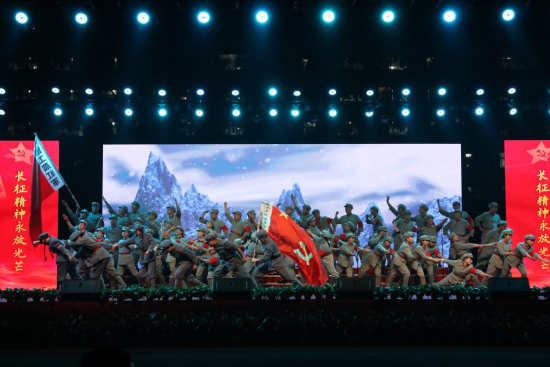 一曲组歌情,十首红歌史。“红旗飘,军号响……”合唱团演员运用朗诵、舞蹈、情景表演的艺术手法,唱出了《告别》的不舍、《突破封锁线》的壮烈、《遵义会议放光辉》的新生、《飞跃大渡河》的艰险,演绎了战士们《过雪山草地》时坚定的意志,以及从《到吴起镇》到《大会师》长征胜利的喜悦心情。