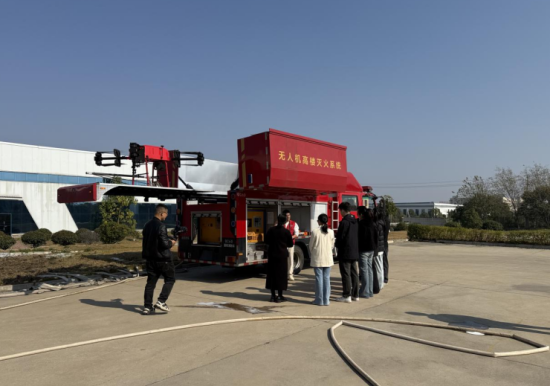 在新余低空经济科创园内,师生们深入园区核心区域,先后参观了元宇宙展览馆、企业装备展厅、无人机生产车间及实训中心,系统了解园区在研发设计、智能制造、应用示范等方面形成的全产业链布局。在专业人员的讲解与现场演示中,师生们集中观摩了无人机在光伏板吊运、CAAC标准实训、毛竹吊运、线路巡检、高楼灭火、末端物流配送、幕墙清洗等典型应用场景,直观感受到低空技术在服务实体经济、城市治理和公共安全中的现实价值。尤其是面向超高层建筑消防需求研发的无人机高楼灭火系统,充分展现了科技创新在提升城市安全保障能力方面的应用潜力,给在场师生留下了深刻印象。