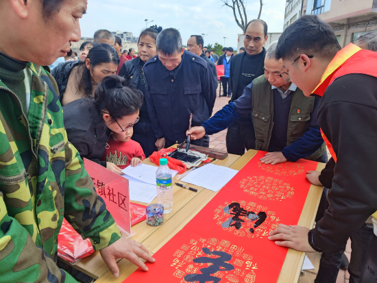 书法爱好者挥毫泼墨,将美好的新春祝福融入笔墨之中。一副副寓意吉祥、字迹工整的春联与“福”字,在书法老师的笔下应运而生。居民们有序排队,挑选心仪的春联内容,拿到春联的居民脸上都洋溢着幸福的笑容。此外,借助此次活动契机,圩镇社区书记还开展了党的二十届四中全会精神宣讲,将社区变化用宣讲的方式向大家展现,广大居民表示:“我们的社区建设得越来越宜居、越温暖,日子也更红火了。”