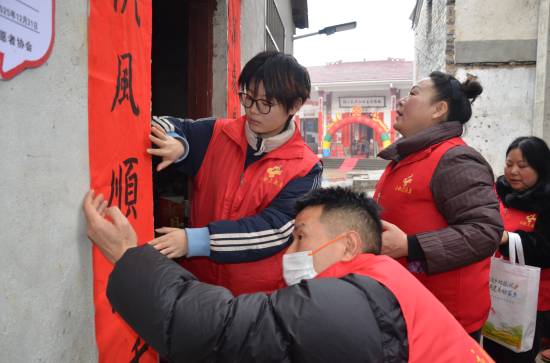 在烟阁乡大山桥村下坊组尹大爷家中,志愿者不仅送上了慰问品,还帮助打扫卫生、擦拭门窗、张贴春联。来自萍乡卫生职业学院的返乡大学生志愿者刘君怡一边贴对联一边说道:“爷爷,祝您新年快乐,身体健康!”老人连声道谢,脸上洋溢着幸福的笑容。