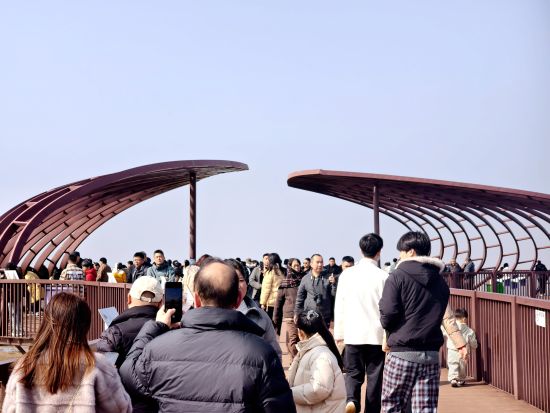 正月初四,吴城狮子山观鸟点的停车场早已停满挂着全国各地牌照的车辆,观鸟长廊上,众多游客或举着相机定格飞羽倩影,或透过免费高倍望远镜追踪鹤群踪迹;望湖亭上,登高望远的游人对着“中国最美水上公路”的春季美景频频点赞;排工巷古街上,“鹤舞新春”民俗展演引得中外游客驻足喝彩。