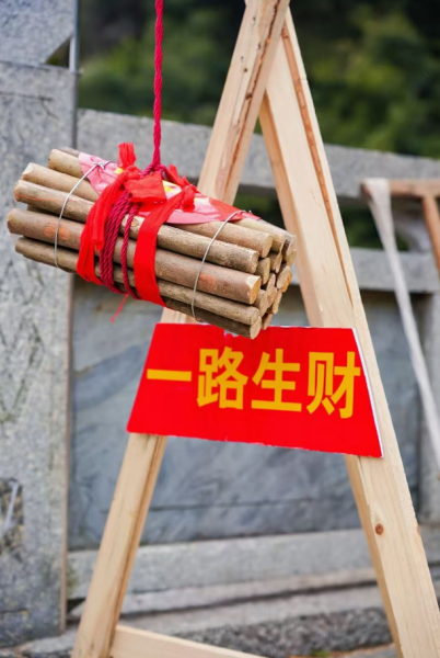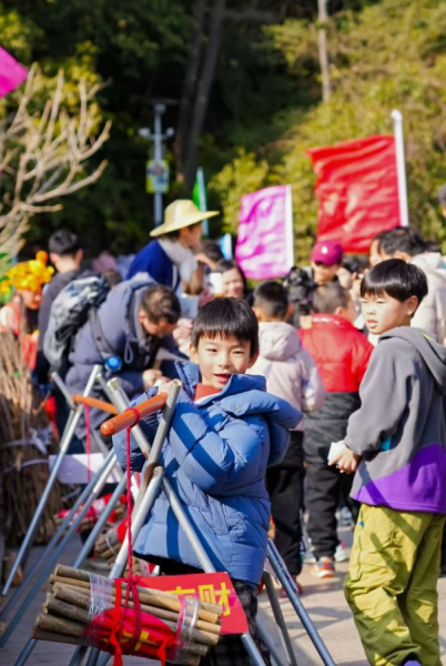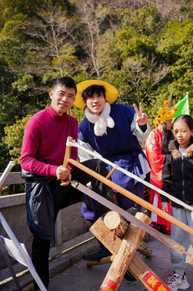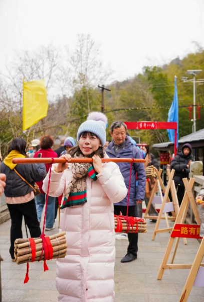 农历正月初五,俗称“破五”。民间相传,这一天既是迎财神的日子,也是开市、开启新年好光景的节点。上午9时,三叠泉景区双溪桥登山入口已是人头攒动。一位身着古装的“樵夫”挑着两捆柴薪,踏着山道缓缓而来。“柴”与“财”谐音,更与“才”相通,在新春里寓意着招财进宝、才气盈门。孩子们争先恐后地接过樵夫递来的“福柴”,家长们则笑着将柴薪捧在怀中,仿佛把一整年的好运都抱回了家。担柴、发柴、堆柴……游客们参与其中,在欢声笑语里体验着这份质朴而温暖的新春仪式。