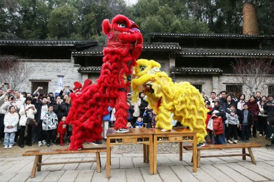 “狮舞新年 龙耀古窑”主题狮舞表演,伴随着铿锵有力的锣鼓声,雄狮腾跃翻滚、摇头摆尾,通过灵动的舞姿传递给每一位游客。“摸摸狮子头,万事不用愁;摸摸狮子尾,顺风又顺水”,不少游客主动上前与雄狮合影互动,沾一沾新春福气,氛围感直接拉满。