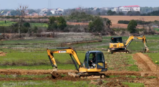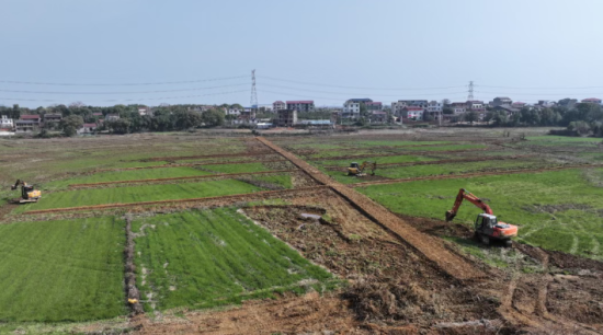 在九房村中赵片区的施工现场,5台挖掘机正在同步开展土地平整和沟渠开挖作业。铁臂起落间,原本零散的田块逐渐规整成型,笔直的灌排沟渠脉络清晰,在春日田野上徐徐铺展。放眼望去,连片的红壤田块高低错落、肌理分明,新翻的土壤泛着温润的光泽,与远处的青苗、村落相映,勾勒出一幅生机盎然的春耕图景。
