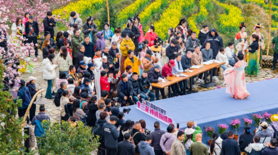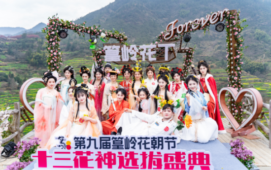 今年,篁岭第九届花朝节的十三花神选拔盛典以种田文风格为引,让十三位承载着历史典故与人文意象的花神形象,在春日篁岭焕活新生。从正月梅花神到腊月水仙花神,更特设一位油菜花花神——依托篁岭“全球十大最美梯田”称号,深度融合本土花海特色,成为本届花朝节独树一帜的春日符号。她们身着贴合典故的华服登临一号观景台,进行T台走秀和才艺表演。有的抚琴,有的跳舞,高潮处频频与台下游客挥手互动,观景台下掌声雷动,现场氛围热烈。