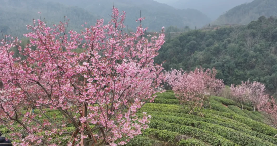 当春风吹过山岗,茶垄间的樱花次第绽放,如云似霞,满树烂漫。漫步其中,花瓣随风飘落,下一场温柔的粉色烟雨。