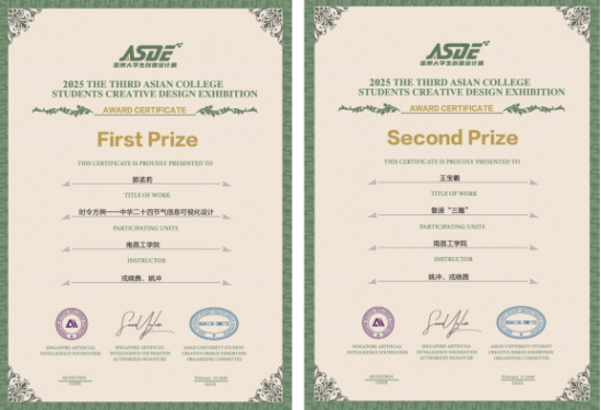 在本次赛事中,作品亮点纷呈:郭孟莉同学的《时令方舆——中华二十四节气信息可视化设计》荣获一等奖;王宝羲同学的《婺源“三雕”》、邹细军同学的《君臣佐使四君子汤信息可视化设计》分别斩获二等奖。多位教师作为指导老师,全程为学生提供专业指导与支持,助力作品在国际舞台上绽放光彩。