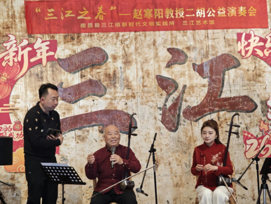 马踏春风来,民乐暖人心。正值丙午马年正月初七,江西南昌县三江镇乌龙街老茶馆内丝竹阵阵、掌声如潮。由南昌县三江镇新时代文明实践所主办的“三江之春”赵寒阳教授二胡公益演奏会在这里如期举行。活动特邀中国著名二胡演奏家、中央音乐学院教授赵寒阳,以及毕业于中央音乐学院民乐系、拥有250多万抖音粉丝的音乐博主“玉公子”邓玉琴联袂登台,以“以梦为马”的奋进姿态,为这座千年古镇献上了一场“文化赋美乡村”的民乐盛宴。