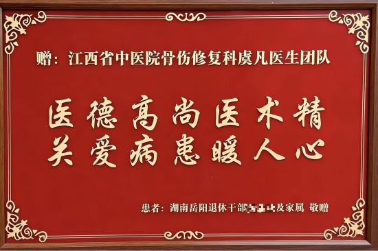 近期,江西中医药大学附属医院修复重建科(手足显微外科)饶泉主任及虞凡医生团队收到了一份特殊的礼物——一块由湖南岳阳患者及家属专程送来的致谢牌匾。牌匾上“医德高尚医术精,关爱病患暖人心”的金色大字,不仅是患者对团队诊疗服务的高度认可,更是医患之间真挚情感的生动写照。