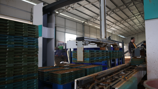 江西一方源农业科技发展有限公司育秧工厂内,机声隆隆、一派繁忙。在农技人员的现场指导下,半自动育秧流水线高速运转,工人们将空秧盘整齐摆放至传送带,机器依次自动完成铺营养土、精准定量洒水、均匀精量播种、覆盖细土等全套标准化工序,每15秒就能完成一盘标准化秧苗制作,随后通过机械转运至催芽暗房,进行恒温暗室催芽作业。