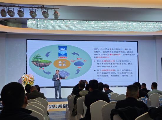 刘云在致辞中介绍,普瑞丰已形成资源与技术的双重核心优势:资源端,与江铜环境、永兴特钢、比亚迪等国内顶尖企业深度合作,实现含硅废弃资源的高值化利用,拥有超5000万吨优质硅矿储备,为产品稳定供应筑牢根基;技术端,独创“分段式催化+维度释放”核心技术,实现硅肥制造的革命性突破,既最大化保留硅元素高活性,又构建了速效+长效的养分释放体系,让活性硅真正适配作物全生育期生长需求。