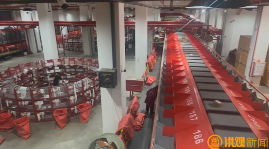 708台分拣小车在双层环线上飞驰,860个格口精准对应全国流向,一个个快递盒从管道落到高达2米的红色纺织袋中。分拣员动作麻利,抬手、扫码、归位一气呵成,脚步在传送带旁快速移动……