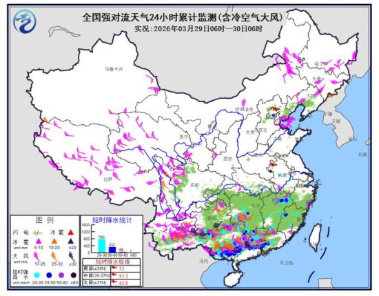 中新网3月30日电 据中央气象台网站消息,气象监测显示,过去一天,南方地区出现大范围雷雨,强对流多点开花,湖南中南部、江西北部、贵州西南部、云南中东部、广西北部和中部、广东中部和西北部等地部分地区出现8~10级雷暴大风、局地11~12级,广西南部、广东中部等地出现30~73毫米短时强降水;广西、广东多个市县观测到冰雹。