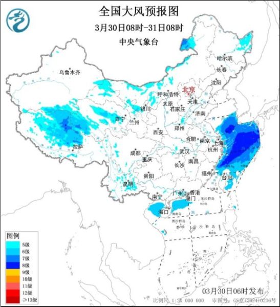 另外,30日白天至夜间,黄海中部海域将有能见度不足1公里的大雾;30日早晨至上午,黄海南部海域、东海西部海域、江苏沿海、浙江沿海、福建北部沿海、长江口及杭州湾附近海域将有能见度不足1公里的大雾。受入海气旋影响,30日午后至夜间,东海、黄海南部等海域将有7~8级、阵风9~10级的大风。 需关注低能见度天气及大风对交通安全的不利影响。